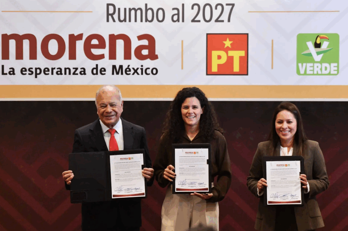 En la Ciudad de México, los dirigentes nacionales de Morena, Partido del Trabajo (PT) y Partido Verde Ecologista de México (PVEM) suscribieron una declaración conjunta en la que ratificaron su compromiso de unidad rumbo a las elecciones intermedias de 2027. Luisa María Alcalde, presidenta de Morena; Karen Castrejón, líder del PVEM; y Alberto Anaya, dirigente vitalicio del PT, coincidieron en que el interés nacional y el proyecto de nación deben prevalecer por encima de las aspiraciones partidistas.