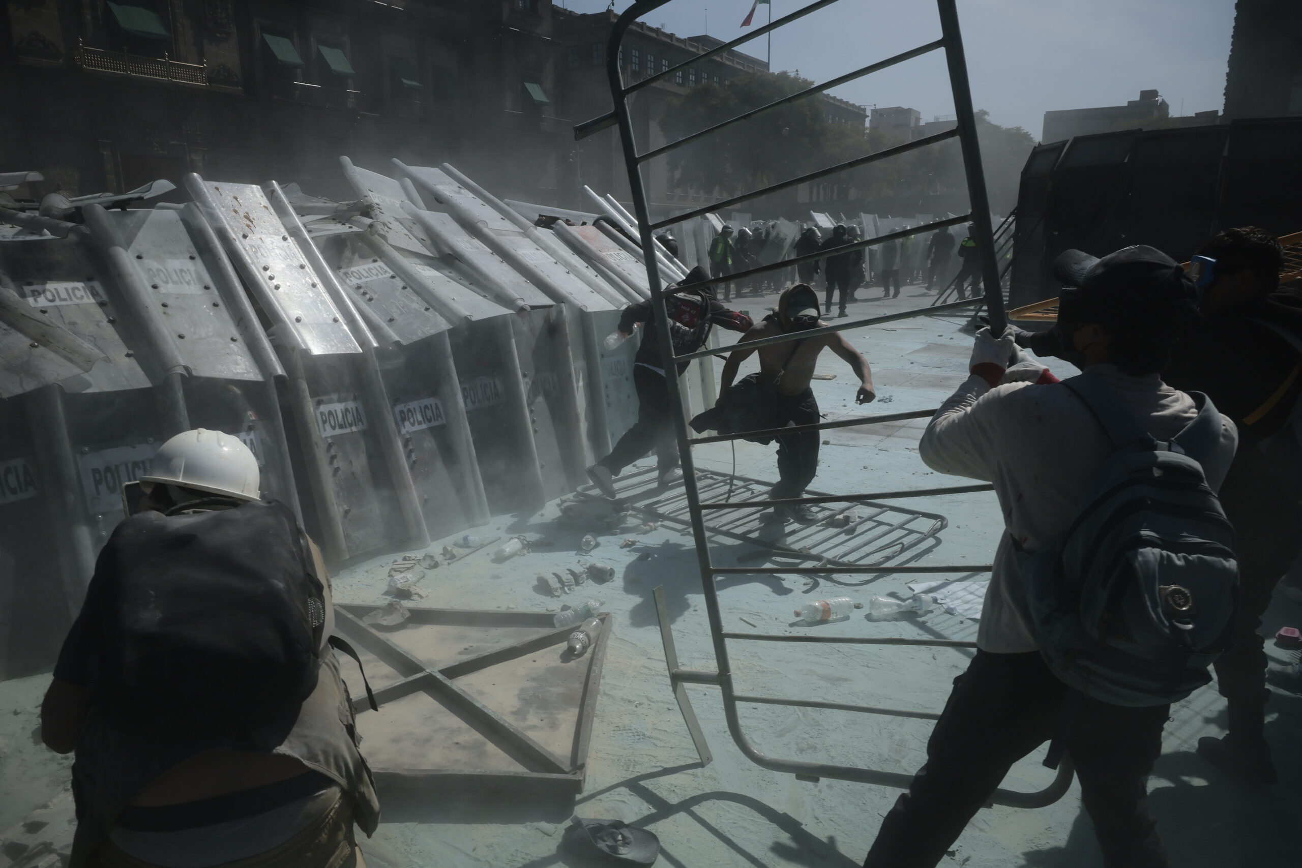La protesta pacífica comenzó en el Ángel de la Independencia y culminó en el Zócalo, donde se registraron los enfrentamientos entre manifestantes y policías. Un grupo identificado como “bloque negro” rompió vallas con martillos y piedras que protegían el Palacio Nacional, lo que provocó que las autoridades respondieran con gas lacrimógeno y extintores.